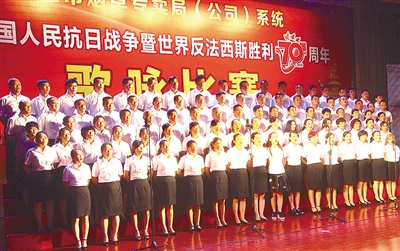 9月1日,为纪念中国人民抗日战争暨世界反法西斯战争胜利70周年,枣庄市烟草专卖局系统在滕州剧院隆重举行歌咏比赛。参加比赛的烟草专卖局系统的干部职工满怀豪情演唱了《地道战》、《游击队之歌》、《我的祖国》等红色经典歌曲,讴歌了中国人民在中国共产党的领导下同仇敌忾、浴血抗敌的伟大的民族精神,展示了烟草专卖局系统的干部职工铭记历史,珍爱和平,一心跟党走的坚强决心。(记者 侯志龙 摄)