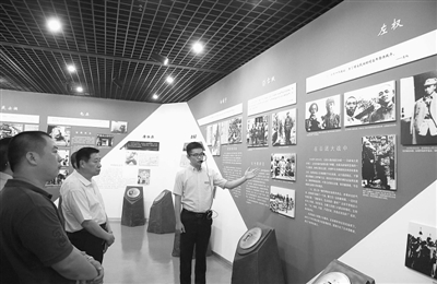9月1日,解说员向参观者介绍抗日英烈的事迹。中国人民抗日战争暨世界反法西斯战争胜利70周年之际,著名抗日英烈和英雄群体大型事迹展在上海龙华烈士纪念馆开展。此次展览以“热血丰碑”为主题,史料均来自日前民政部公布的首批300名著名抗日英烈和英雄群体的事迹,充分反映了中国人民保家卫国,抗击日本侵略者的英勇斗争史。 (新华社记者 裴鑫 摄)