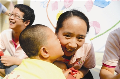 9月9日,至爱阳光自闭症儿童康复中心的小朋友为老师送上亲吻祝福。
