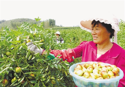 山亭区积极为当地优质农产品“走出去”搭建电子商务平台,通过筹建淘宝网特色中国山亭馆、入驻京东商城等开展网上营销,提升农产品产销对接效率,实现了农产品“触电”畅销全国,促进了农民增收。图为9月9日,山亭区一果树种植专业合作社的工人在采摘网络客户订购的脆枣。 (李宗宪 褚召亮 摄)