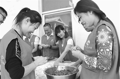 9月13日,台儿庄区阳光爱心团在泥沟镇敬老院给五保老人包水饺。连日来,台儿庄区阳光爱心团捐款购买面粉、猪肉等物品走进全区6所镇街敬老院,给入住的五保老人包水饺,受到了老人们的欢迎。 (张晶 刘凤琦 摄)