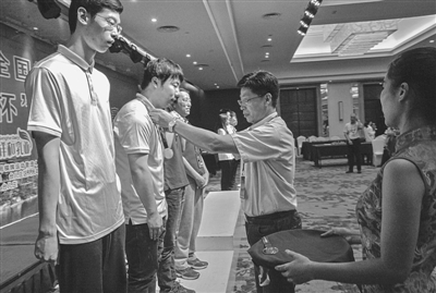 9月18日,第三届全国智力运动会国际象棋比赛最后四个团体项目结束。图为祥和乳业公司总经理阚凯为大学生团体赛前三名的代表队颁发奖牌。 (记者 王飞龙 摄)