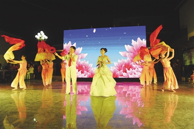 9月24日晚,市中区光明路街道涝坡村村民自发组织了“迎中秋庆国庆”农民大联欢活动,全村群众争相参加。图为演出现场。 (记者 赵宁 摄)