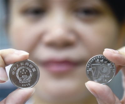 当日,中国人民抗日战争暨世界反法西斯战争胜利70周年镍包钢材质纪念币开始发行。此次发行的纪念币面额1元,直径25毫米,材质为镍包钢,与同面额人民币等值流通,全国发行数量为5亿枚。 (新华社发)