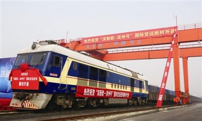 10月16日,“滨新欧-滨州号”货运班列准备出发。当日,由46个车皮、满载2760吨卷钢的“滨新欧-滨州号”79588次国际货运班列从山东滨州市博兴火车站出发,开往乌兹别克斯坦。据济南铁路局介绍,“滨新欧-滨州号”货运班列运行线路初步设计为“一干两支”,主干经新疆的阿拉山口到乌兹别克斯坦的塔什干,途经哈萨克斯坦的阿拉木图进行货物分拨,全程5630公里;支线一通过满洲里或二连浩特进入俄罗斯克拉斯诺亚尔斯克,全程9661公里;支线二通过阿拉山口进入德国的杜伊斯堡,全程11161公里。 (新华社记者 周科 摄)