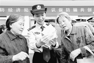 10月19日,民警在齐村集市上向群众讲解人民币真假的辨别。今年以来,市中公安分局经侦大队组织民警深入到偏远农村集市摆摊设点,向群众宣讲防电信诈骗、识别真假人民币等常识,提高群众的防范意识。 (吉喆 贾方勇 摄)