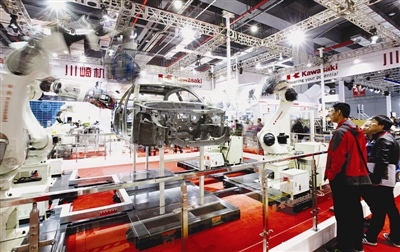 11月3日,观众在观看机器人焊接车身演示。当日,2015年中国国际工业博览会在上海开幕。本届工博会将持续5天,以“创新、智能、绿色”为主题,设有工业自动化、节能与新能源汽车、机器人和航空航天技术等9大专业展,展示规模达23万平方米,超过2200家参展商参展,比上届增长38.55%,均创下历史新高。 (新华社记者 方喆 摄)