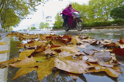 11月6日,山亭区市民在落叶满地的街道上冒雨行进。6日至8日,我市出现了一次明显的降雨天气过程。此次降雨,对于缓解当前严重旱情、净化空气质量十分有利。 (刘明祥 摄)