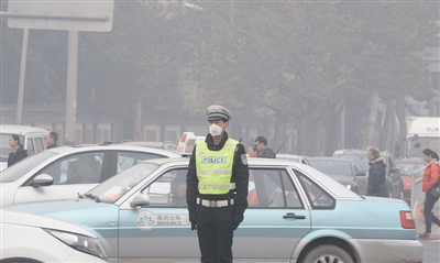 ➝11月12日,在济南市解放桥,一位交警在雾霾中执勤。当日,济南市区的空气首要污染物为pm2.5,市区12个检测点的空气质量指数均大于300,空气质量为严重污染等级。 (新华社发)