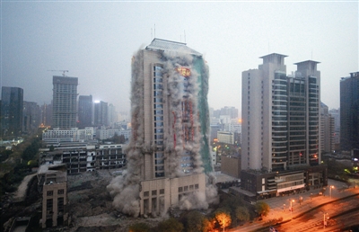 11月15日7时,西安市高新二路16号高层建筑定向爆破拆除获圆满成功。该大楼地下1层、地上26层、高118米,总建筑面积37000多平方米,仅完成主体和外立面建设,至今未正式投用。因闲置时间较长,该大楼已不具备改造使用条件。未来,将在该大楼原址建造一个新的商业综合体。这是目前国内城市爆破拆除中最高的楼房,成为“全国第一爆”。 (新华社发)