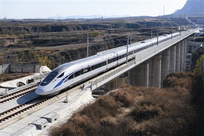 11月18日,我国具有完全自主知识产权的时速350公里中国标准动车组,在大西(大同至西安)客运专线跑出385公里/小时的试验速度,列车各项技术性能表现优异,通过了高速试验“大考”。 (新华社发)