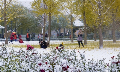 图为11月22日,游人在玉渊潭公园银杏林嬉戏。