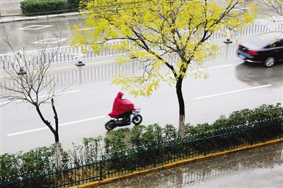 11月23日,市民在市中区文化路上冒雨骑行。连日来,我市普降小到中雨,驱散了连续多日的雾霾天气。据市气象台最新预报,23日夜间到24日我市将出现雨夹雪转中雪天气,雨雪过后气温大幅下降,预计26日早晨和27日早晨的最低气温在-9℃左右。 (吉喆 摄)