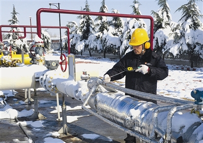 11月25日,华润燃气运行工在天然气门站记录管网运行压力。初冬的的一场暴雪,打破了市民的正常生活。华润燃气及时启动低温天气应急预案,加大管线和居民、工商用户巡检力度;随时接听并处理用户报修,截至25日下午共接报修电话6起,均已快速、安全处理完毕,有力保障了天然气安全供应。 (刘敏 摄)