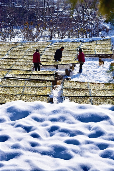当日,雪过天晴,寒气袭人。而在地瓜加工出口专业村——水泉镇大马湾村,却是一派热火朝天的增收场景,村民们忙着将地瓜加工成香脆可口、绿色保健的出口产品实现农闲增收,冬日山村到处呈现出“雪映金条”的独特景观。 (刘明祥 摄)