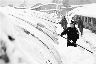 11月25日,孟庄派出所驻村民警在大尚岩村帮助农民清理温室大棚上的积雪。近日的一场暴雪导致我市部分区、市蔬菜温室大棚受损严重。市公安局积极组织各区、市公安分局驻村民警开展了抗雪灾保生产活动,帮助农民清理温室大棚上的积雪,把受到冻害的蔬菜转移到安全地带,力争把自然灾害损失减少到最低程度。 (吉喆 摄)