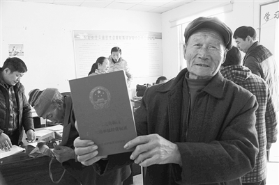 →12月21日,山亭区凫城镇张庄村农民孙宝坤高兴的领到了农村土地承包经营权证。连日来,山亭区有2100户农民领到了土地确权证,让农民吃下了定心丸。(王飞龙 王启蒙 摄)