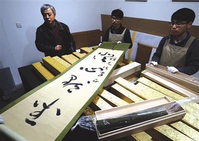 →1月5日,浙江美术馆工作人员在验收从美国运抵杭州的书画作品。