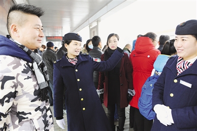 入冬以来,市公交总公司着力打造温暖出行服务,精心组织人员维持站台秩序,疏导乘客上下车,并根据客流情况适时调配运力,缩短市民等车时间。图为1月6日BRT站台服务人员在解答乘客咨询。 (记者 张晶 通讯员 马秀标 摄)