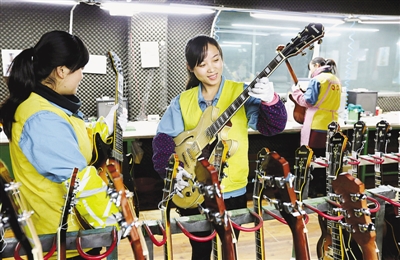 1月7日,市中区新韩乐器厂的设计人员在查看吉他新产品。近年来,市中区在发展民营企业中,采取专业培训、院校进修等多种方式,已培养出服装、玩具、乐器等多门类的设计专业人员2000多名。这些“草根”设计师的产品,不仅占领了上海、北京、深圳等国内市场,还出口到美国、英国、日本等20多个国家,成为地方经济发展的助力器。 (吉喆 耿德刚 摄)