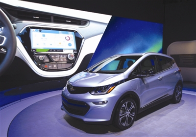 这是1月7日在美国拉斯韦加斯国际消费电子展上拍摄的雪佛兰Bolt EV电动车。车载互联网、自动驾驶等技术是2016年美国拉斯韦加斯国际消费电子展(CES)的热点之一,众多“驶向未来的汽车”在展会上亮相。 (新华社记者 杨磊 摄)