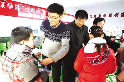 日前,临沂大学“七彩小屋”的志愿者来到山亭区店子镇龙虎小学,为师生们送去了围巾、书籍、文具等爱心礼物,并通过当地大学生村官的帮带作用,将该小学定位为爱心援助支教点。图为志愿者在为学生们发放礼物。 (张晶 杨和山 摄)