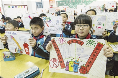 → 日前,团市委、市教育局等五部门联合在全市少先队员中开展了“小手拉大手,共筑碧水蓝天”环保行动,引导他们在寒假期间从垃圾分类、禁燃烟花爆竹、绿色出行等小事做起,争当保护环境的小卫士和环保宣传的小使者。图为山亭区实验小学举办的“抵制烟花爆竹”手抄报比赛。 (赵宁 摄)