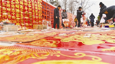 春节临近,在山亭区乡间大集上,浓浓的年味扑面而来,式样繁多的春联、灯笼、中国结等映红了山乡,到处是一派热闹祥和的景象。图为1月28日,当地居民在年集上挑选春联。 (刘明祥 摄)