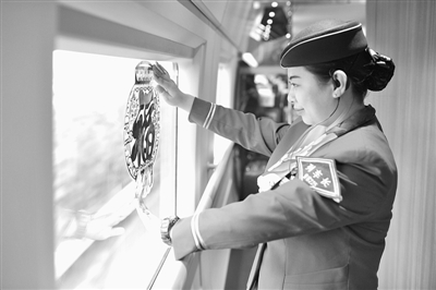 2月4日,杨蕾在青岛发往北京南的G188次列车上贴窗花。