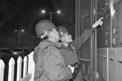 薛城供电客服分中心200余名员工除夕夜坚守工作岗位,开展设备巡视,进行应急抢修,并对重点用电台区现场蹲守,让全区人民用上了安全电、放心电。图为工作人员巡视城区供电环网柜。 (张生 吴超 摄)