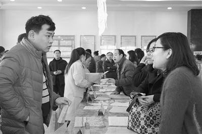 2月17日,在峄城区举行的“春风行动”大型招聘会现场,求职者在和用人单位工作人员洽谈。