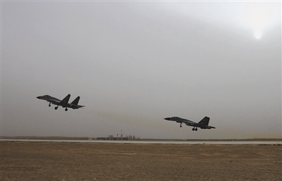 2月18日,战士驾驶战机起飞,展开空中对抗训练。当日,西部战区空军航空兵某旅在新疆开展春节后飞行训练。战士们不畏严寒与风沙,在沙漠戈壁上空进行跨昼夜对抗空战训练,以锤炼部队全疆域、全天候作战能力。新华社发(刘应华 摄)