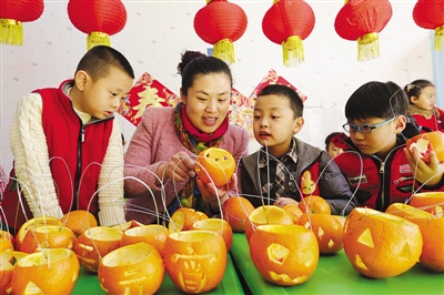 2月18日,市中区文苑小区幼儿园开展以制作“小桔灯”迎接元宵节为主题的教育活动。老师和小朋友们一起动手,用桔子皮制作低碳环保的元宵“小桔灯”,弘扬民间传统手工艺术,让小朋友们体验自己动手的快乐。 (吉喆 摄)