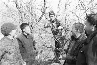 为加强春季农业生产,峄城区榴园镇组织动员各村种养能手和农技带头人深入田间地头,向广大农户传授种养技术。目前,全镇共有400多名种养能手和农技带头人投身此项活动,累计受益农户达1000余户。图为贾泉村石榴种植能手王延省向石榴种植户传授技术。 (孙启路 孙伟 摄)