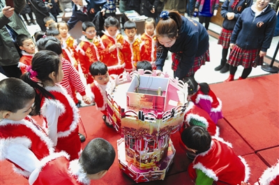 2月22日,哈尔滨市东方剑桥幼儿园的小朋友们在观看走马灯,这盏花灯内部装有小型电机,通电后花灯便自行转动。当日,“环保材料做花灯,欢天喜地迎元宵”节庆活动在黑龙江省博物馆开展,本次活动中310盏展出的花灯由310名哈尔滨市民利用纸壳、包装袋、衣架等废旧物品作为基础材料制作而成。 (新华社记者 王松 摄)