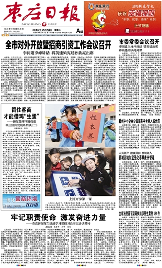 枣庄日报社党委委员、副总编辑尤毅说:“习总书记在党的新闻舆论工作座谈会上的重要讲话,给我们释放了很多重要信号,令我印象最深的,一是定位。习总书记这次把新闻宣传摆在了前所未有的高度,鼓励新闻工作者多出有思想、有深度、有品质的作品。二是导向。不仅党报、党刊,电台、电视台要讲正确的新闻导向,晚报、都市生活报、网站等媒体也要讲导向,新闻报道和媒体广告同样也要讲正确的新闻导向。三是人才。 (下转A2版)