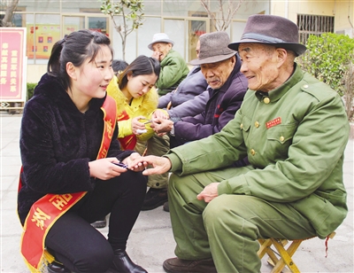 近日,枣庄科技职业学院的20多名学生带着蛋糕、香蕉等食物来到滕州市光荣院看望老人。为老人打扫卫生、陪老人聊天、为老人剪指甲。89岁的杨海平老人高兴地说:“虽然天气是冷的,但看着孩子们做的这一切,心里却暖暖的。” (特约记者 侯志龙 摄)