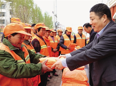 4月6日,山亭区130名城区环卫工人收到了一份特殊的礼物:“爱心雨衣”。这是该区爱心企业华宝牧业有限公司为感谢环卫工人奉献优美整洁的城区环境而特地赠送的。 (李宗宪 摄)