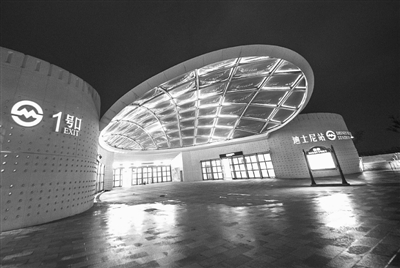 这是4月24日拍摄的上海地铁11号线迪士尼站外景。据介绍,上海地铁11号线迪士尼站将于4月26日上午试运营,人们从市区可乘坐地铁到达上海迪士尼度假区。 (新华社发)