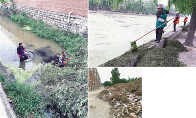 右上图:环卫工人在薛城区长江路长江桥下清理河道中的杂草。