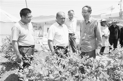 5月17日,省果树专家刘庆忠(前右一)在蓝莓基地授课。连日来,山亭区聘请果树、蔬菜等农业专家就水泉镇樱桃、凫城镇蓝莓等进行田间现场授课,受到农民欢迎。 (王启蒙 摄)