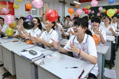 5月22日,河北省衡水市第二中学的高三学生在教室里用放气球的方式舒缓心情。2016年高考临近,考生复习进入最后冲刺阶段。河北省衡水市第二中学采取多种方式帮助考生放松身心,考前生活张弛有度。 (新华社记者 牟宇 摄)