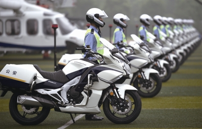 5月27日,警察携警用摩托参加誓师大会。当日,浙江省在浙江警察学院举行G20峰会安保工作誓师大会,本次大会共集结了24个方阵,分别由武警总队、各市公安局、交警、特警、边防、消防、警卫、高速、机场、学警以及保安代表组成。 (新华社记者 王定昶 摄)