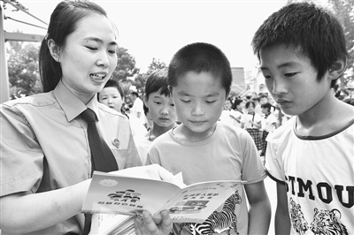 7月4日,在枣庄市第三十三中学校园,检察官给学生讲解暑假安全保护知识。