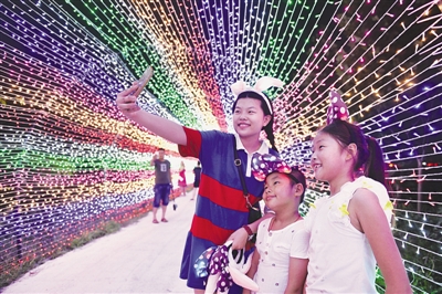 8月1日,游客在“梦幻银河”灯光节中赏灯拍照。当晚,以“浪漫田园·梦幻涛沟”为主题的灯光节在台儿庄区邳庄镇开幕,由5000万支LED创意灯饰组成“梦幻银河”、“爱情通道”等几十组光影雕塑,与田园风光结合在一起,流光溢彩,令人流连忘返。 (高启民 摄)