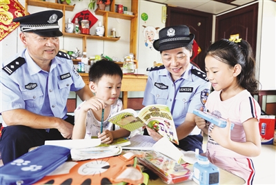 8月17日,运河水上派出所民警为黄佳琪、黄佳乐姐弟俩送去了儿童图书。暑假期间,台儿庄区运河水上派出所开展“情系小候鸟,快乐过暑假”活动,和辖区水上运输的船民子女进行爱心结对,为“小候鸟”们免费送去图书、铅笔、书包等学习用品。据了解,京杭运河台儿庄段每年随父母行船的“小候鸟”达400多人。 (高启民 摄)