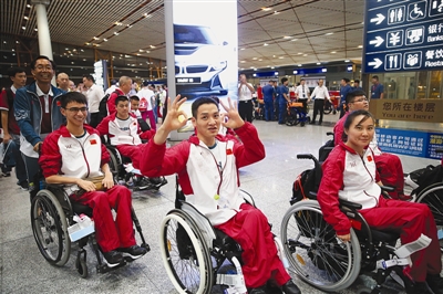 8月30日,运动员抵达机场准备出发。当日,里约残奥会中国体育代表团从北京首都国际机场出发,奔赴里约。第十五届残奥会将于9月7日至18日在巴西里约热内卢举行,共设22个大项、528个小项。中国体育代表团由499人组成,其中运动员308人。 (新华社 发)