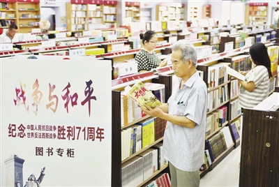为纪念中国人民抗日战争暨世界反法西斯战争胜利71周年,市新华书店专门开辟“抗战题材”图书专柜,《大抗战》、《抗日战争》、《铁道游击队》等一批优秀军事类抗战题材图书在书柜展销,方便读者选购。(高启民 李瑞刚 摄)
