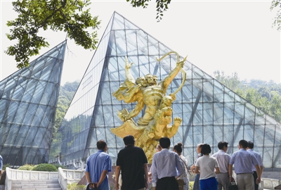 →9月2日,参加座谈会的代表从抗日航空烈士纪念馆“正义之神”雕塑前经过。