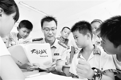 9月1日,在水泉镇兴国希望小学,武装部干部张鹏给学生们讲抗战故事。